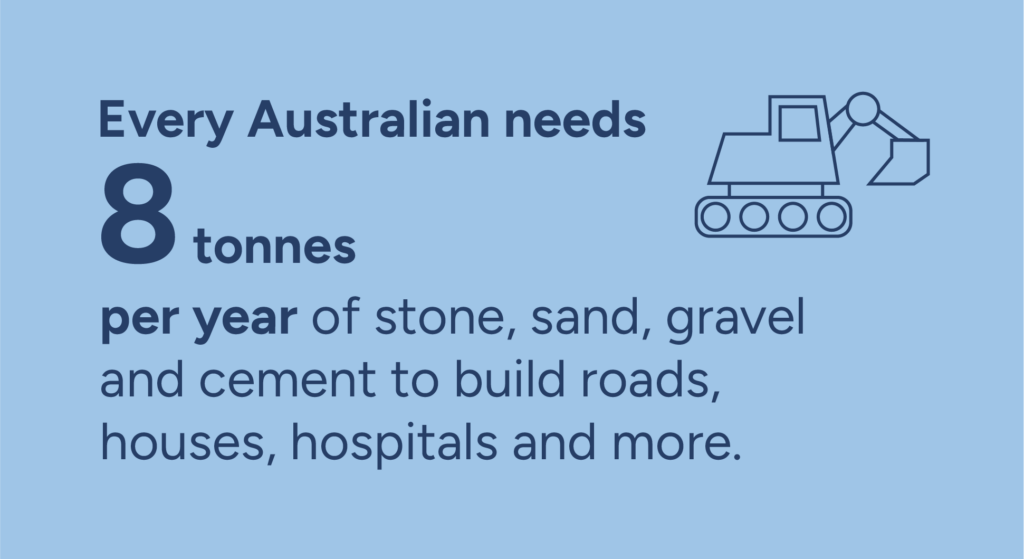 Every Australian uses around 8 tonnes of stone, sand, gravel, and cement each year to support essential infrastructure like roads, houses, hospitals, and more.
