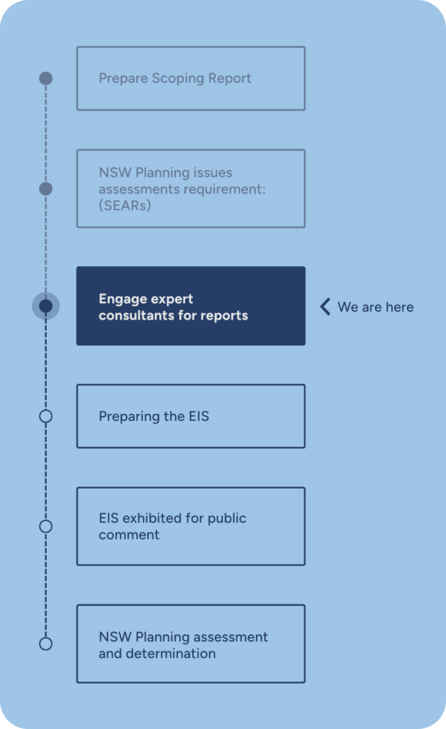 Bluestone Hardrock is advancing through its planning stages. Key documents – including the scoping report, SEARs, and agency advice – are available on the NSW Planning Portal. An Environmental Impact Statement (EIS) is currently being prepared, a key step toward final approval. We remain committed to community consultation as the project progresses.